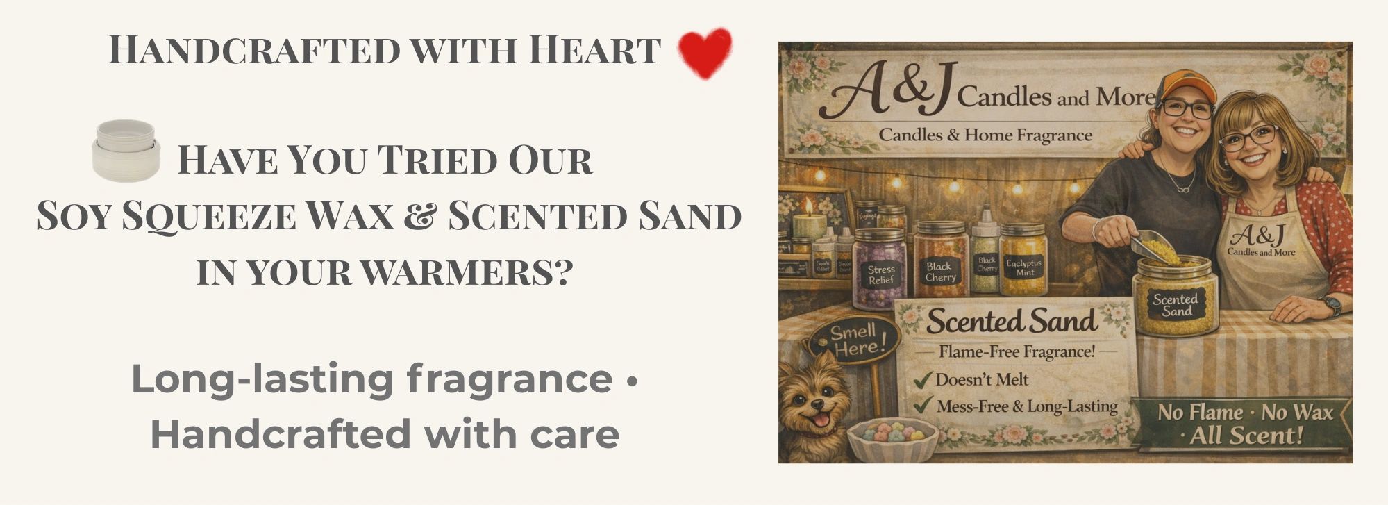 A & J Scents is more than just a business—it's a labor of love built with my daughter. Together, we’ve poured our creativity into high-quality handcrafted scents. Scented Squeeze Wax and Scented Sand that bring warmth, comfort, and a personal touch to any space. Our vision is to share our passion for unique, beautifully scented products that make your home feel cozy and inviting. Every scent tells a story, and we can’t wait for you to be a part of ours.